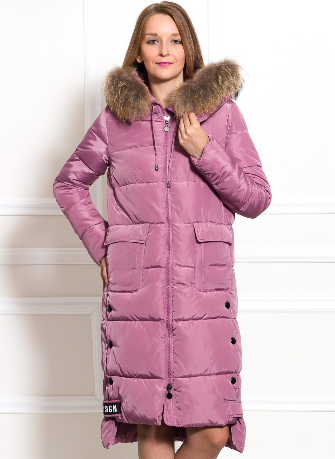 Dámská zimní bunda s cvoky v růžové barvě. Bunda má délku ke kolenům. Součástí bundy je kapuce, na které je pravá liška. Bunda má zapínání na zip a je volnějšího oversize střihu. Po stranách má bunda kapsy na patenty. Dolní část je dozdobena výraznými cvoky a černým lemem s nápisem. Zadní strana je delší než přední. Hodí se ke každodennímu nošení.