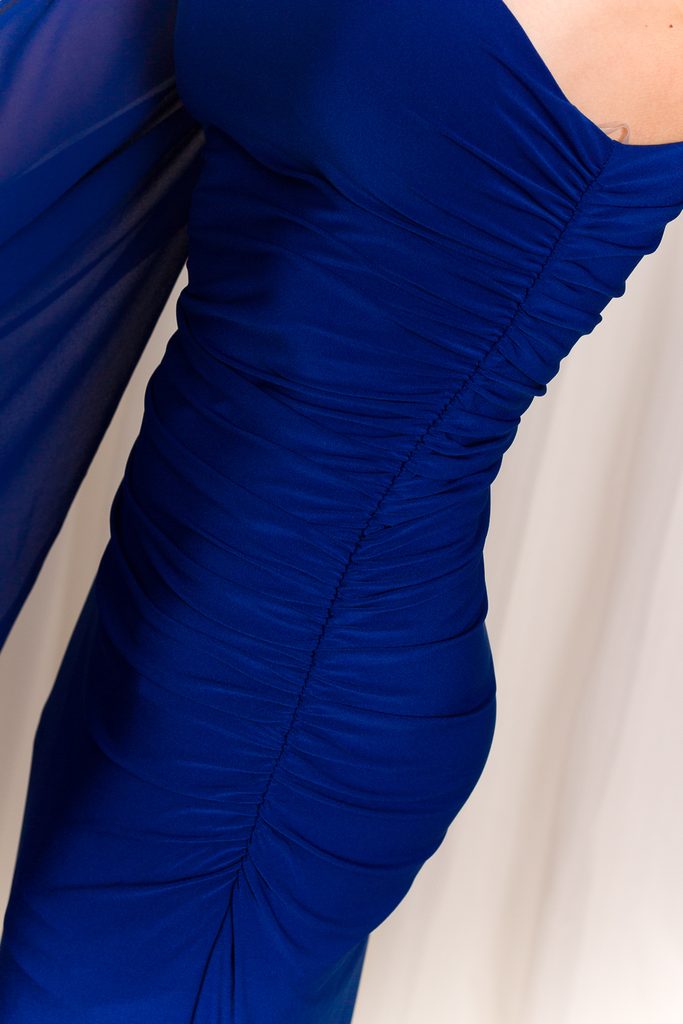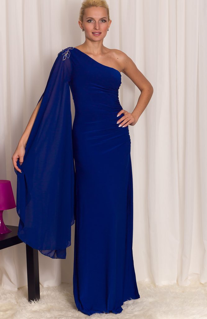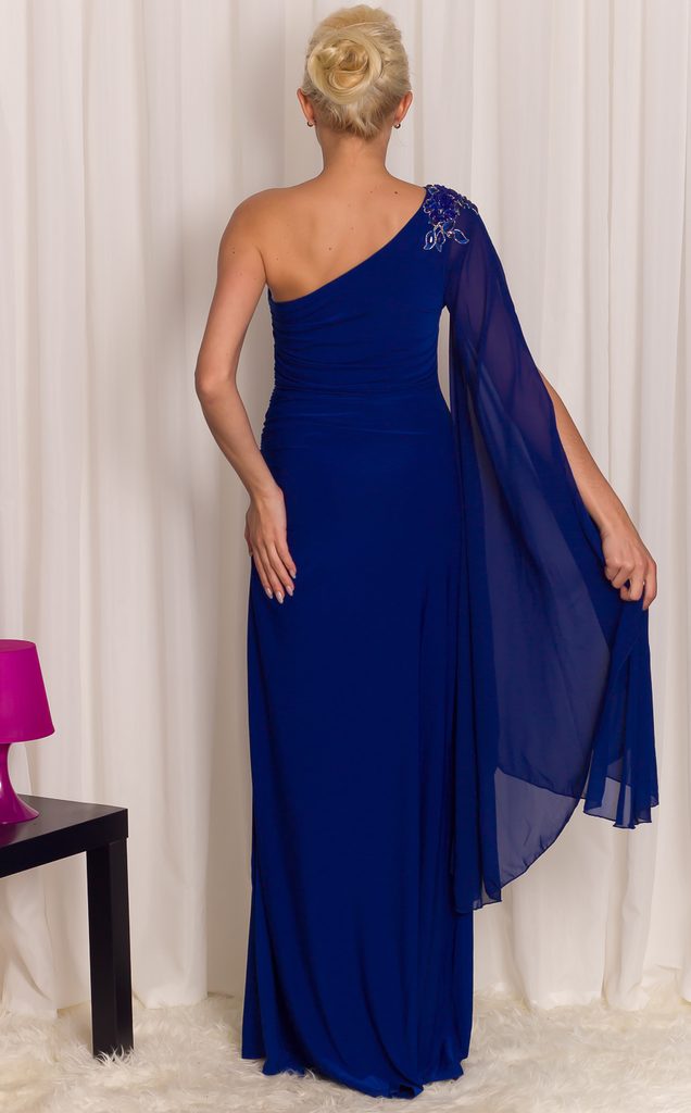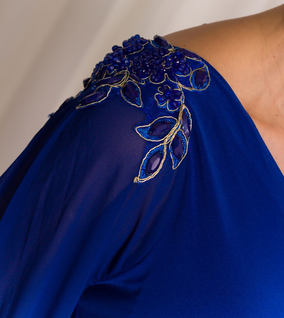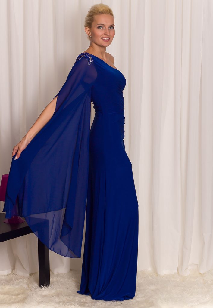 Dlouhé společenské jedinečné šaty v královsky modré barvě. Šaty jsou na jedno rameno. Na prsou mají vycpávky. Originálním detailem je rukáv, který je z jemného šifonu. Na rameni zdobí šaty zlaté květiny s modrými korálky. Na bocích jsou šaty velmi elastické a jsou lehce staženy. Na jedné straně je rozparek. Šaty jsou uplého střihu, skvěle sedí. Vhodné na plesy či společenské události.