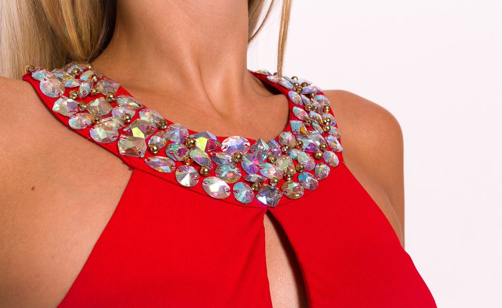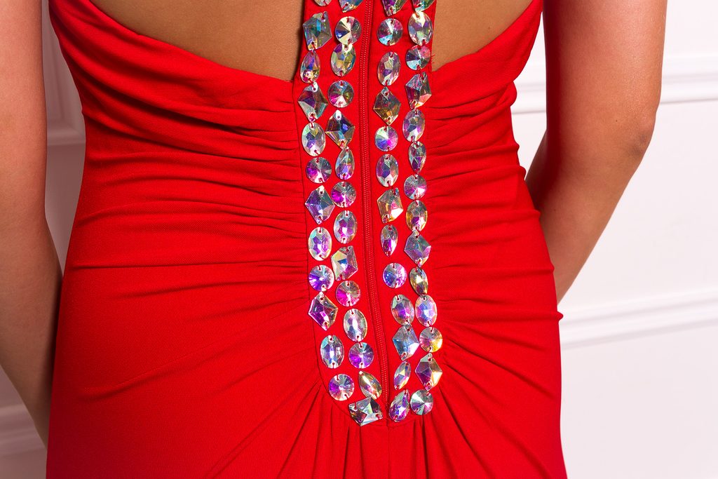 Společenské dlouhé šaty s kamínky v červené barvě. Velmi luxusní šaty jsou tvořeny kolem krku. Kolem krku a společně i záda se zipem zdobí velké kamínky. Tím šaty vypadají velmi exkluzivně a luxusně. Na prsou mají šaty vycpávky. Dekolt je zdoben malým výkrojem. Šaty mají úzký střih, skvěle sedí na těle, což zvýrazní Vaše křivky. Vhodné na plesy či společenské události.
