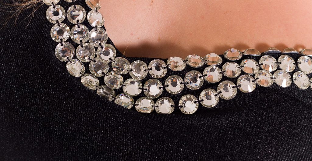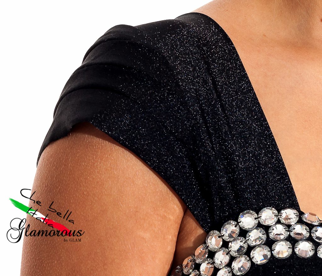 Dlouhé a lesklé šaty s velkými kamínky v černé barvě. Šaty mají široká ramínka. Šaty mají u výstřihu kamínky ve třech řadách a na prsou jsou vycpávky. Šaty jsou rovného střihu. Ramínka lze nosit i lehce stažené. Vhodné jsou na společenské události jako jsou například plesy či maturáky.