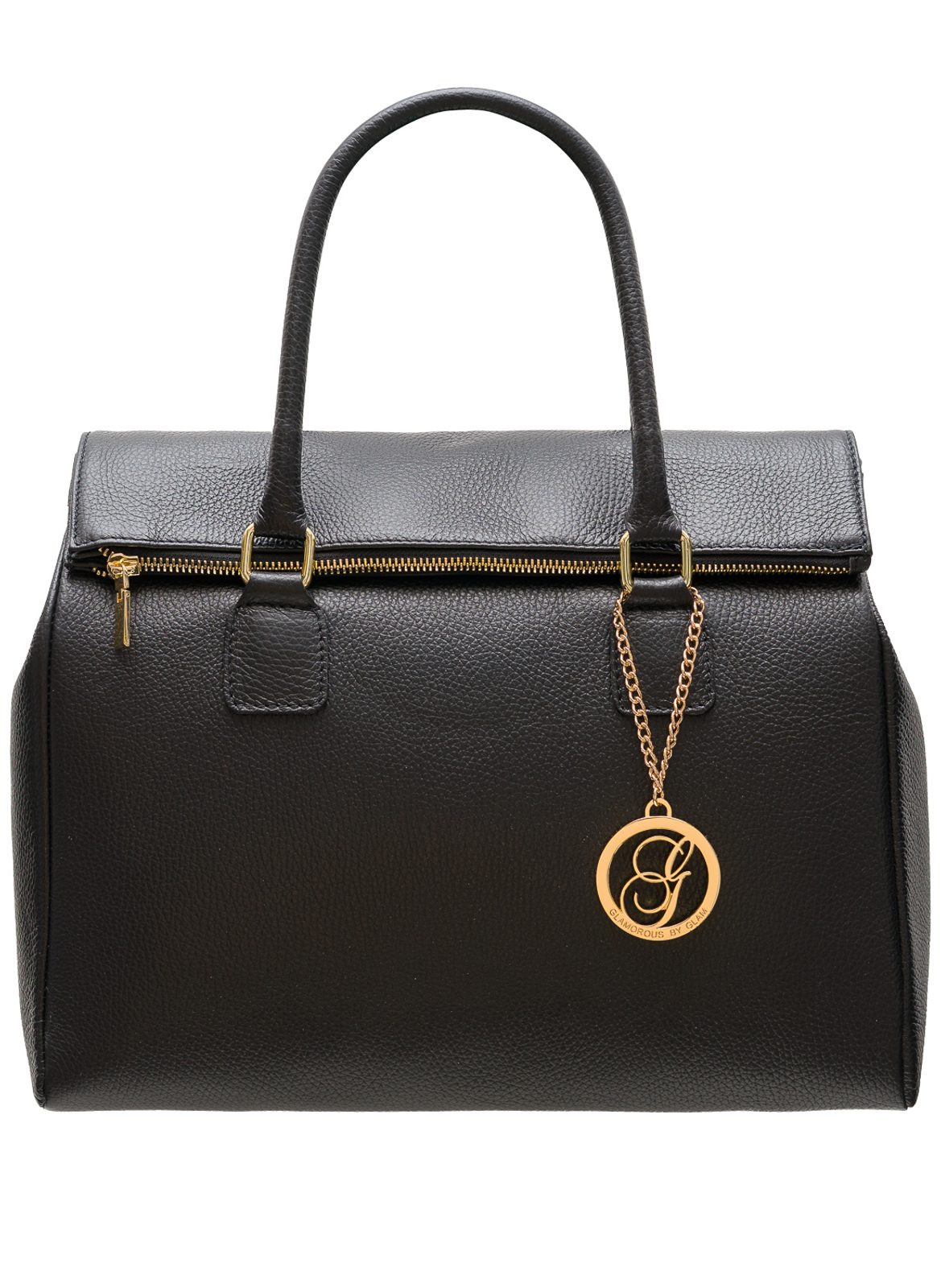 Dámska elegantná kabelka v čiernej farbe. Kabelka je celá kožená a drží tvar. Kabelka má kratšiu pútka pre nosenie v ruke. Zapínanie kabelky je riešené na zips, ktorý je ľahko prehnutý cez okraj. Do kabelky sa vojde aj formát A4. Kovanie je zlaté a u pútka nechýba zlaté logo Glamorous by Glam. Na zadnej strane má kabelka malú kapsičku na zips. Kabelka sa hodí k eletgantnímu outfitu, ale aj k džínsom. Môžete jej vziať do práce aj do mesta. Súčasťou kabelky je prídavný track.