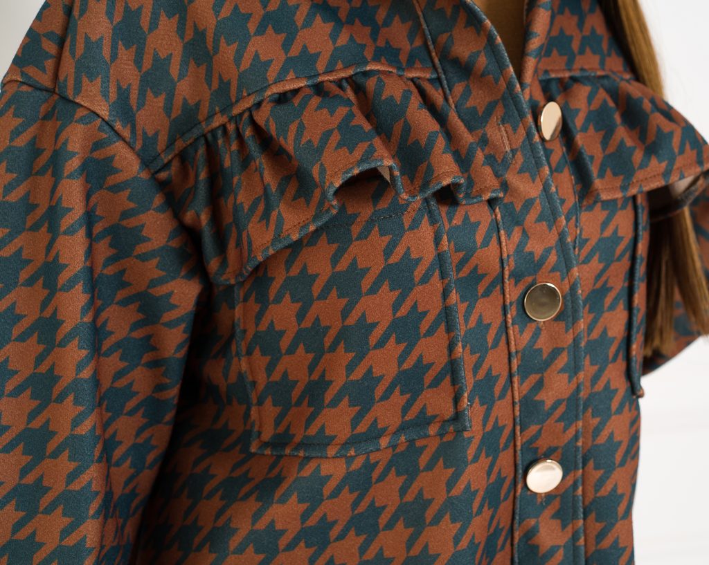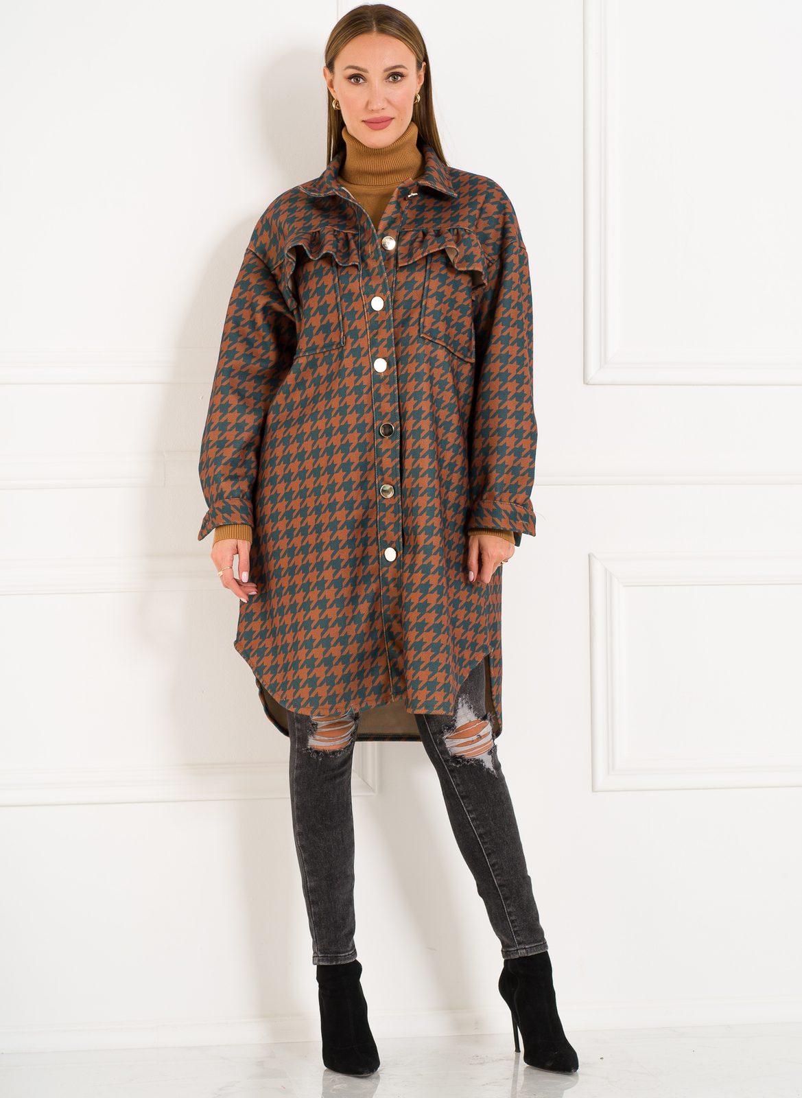Dámský oversize kabát v petrolejové barvě. Kabát má 3/4 délku a zapínání na knoflíky. V horní části má kabát kapsy s volánky. Kabát má výrazný pepito vzor, zajisté zaujme Vaše okolí. Hodí se ke každodennímu nošení do práce i do města.