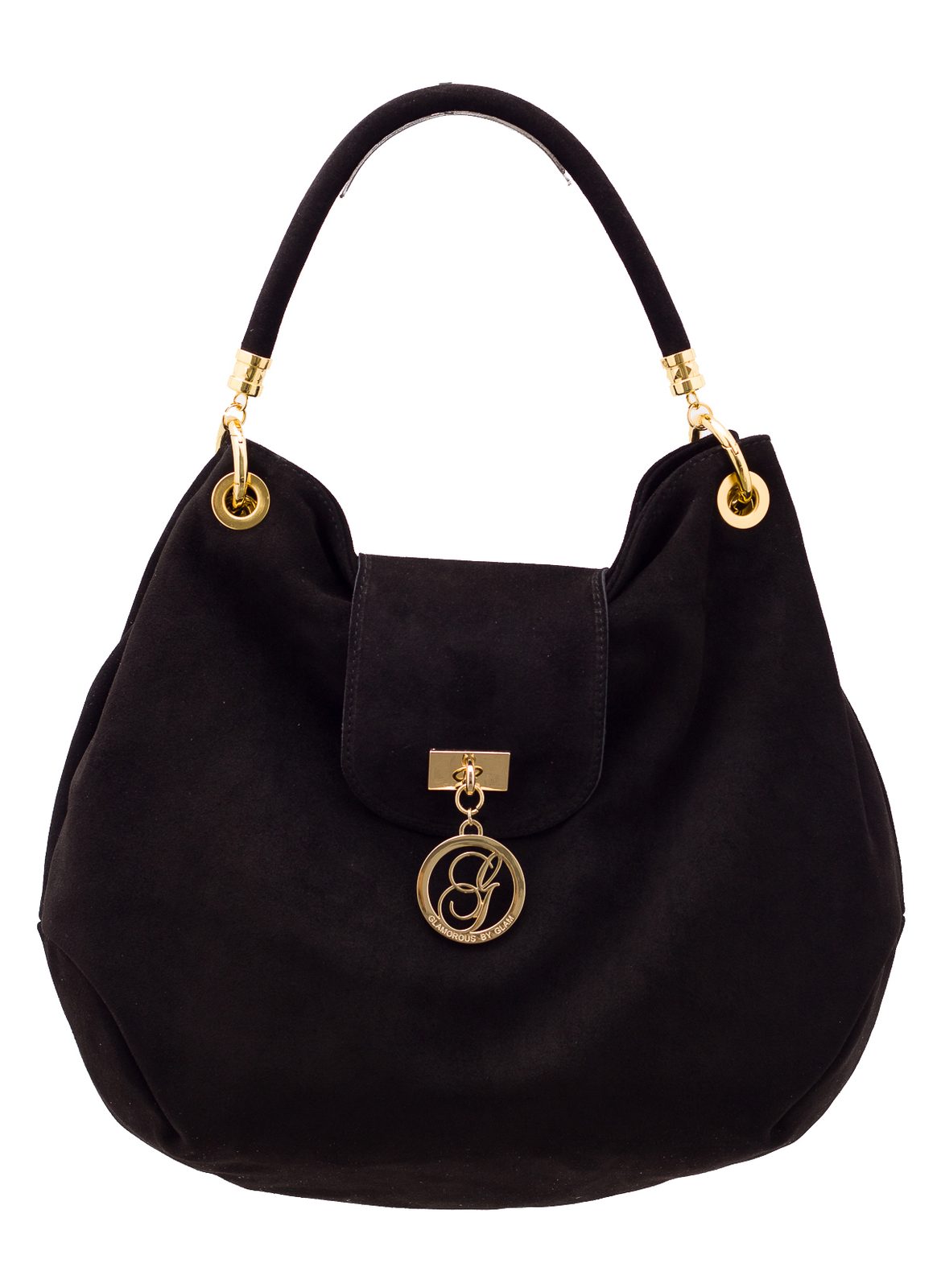 Dámská elegantní kabelka v černé barvě. Kabelka je z broušené kůže. Zapínání má kabelka na patent, velké poutko přes rameno. Na přední straně je logo Glamorous by Glam. Doplňky jsou zlaté. Do kabelky se vejde i formát A4. Kabelka je vhodná k nošení do práce i do města.