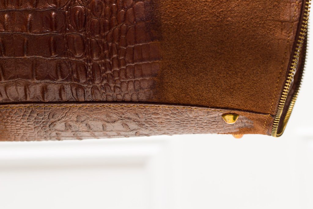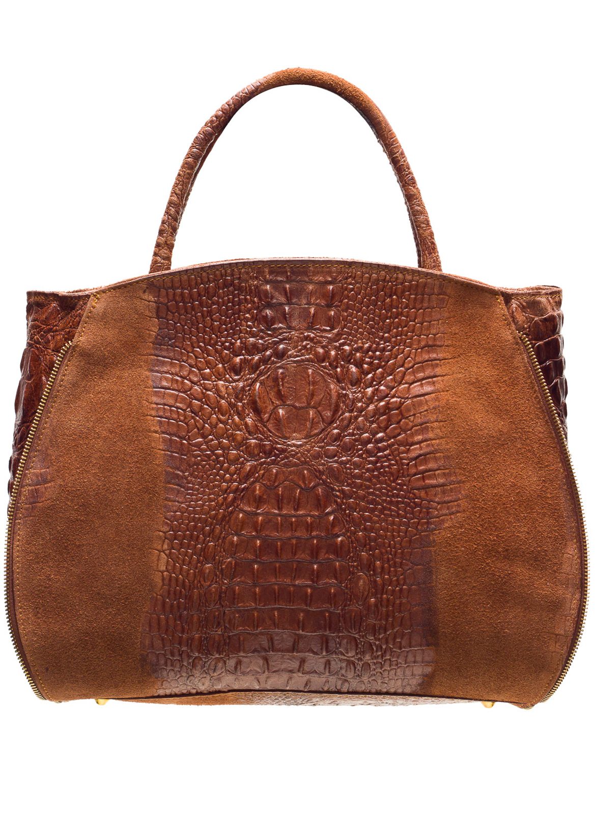 Dámská elegantní kabelka v hnědé barvě. Kabelka je celá kožená a je se vzorem krokodýla. Drží tvar a vejde se do ní i formát A4. Po stranách má kabelka na ozdobu zlatý zip, tím kabelka vypadá velmi originálně. Zapínání je řešeno na zip. Krátká poutka pro nošení v ruce. Kabelka se nejvíce hodí k elegantnímu outfitu, do práce i do města. Součástí kabelky je i přídavný track.