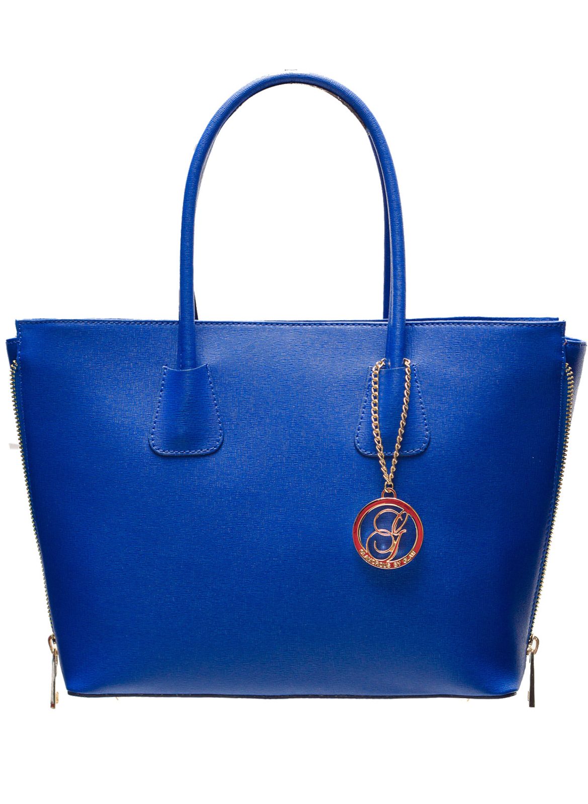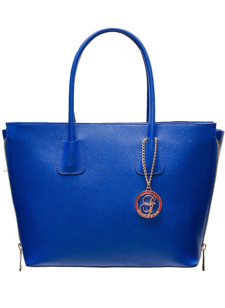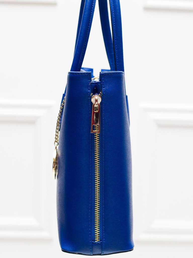Dámska elegantná kabelka so zipsom v kráľovsky modrej farbe. Kabelka je celá zo safiánové kože, drží tvar. Má krátka pútka na nosenie v ruke. Zapínanie je riešené na zips. Boky kabelky sú dozdobené zipsom, ktorý je možné rozopnúť / zapnúť. U pútka je na ozdobu zlaté logo Glamorous by Glam. Kabelka je veľmi zaujímavá svojím strihom. Hodí sa k elegantnému outfitu do práce aj do mesta. Súčasťou kabelky je aj prídavný track.