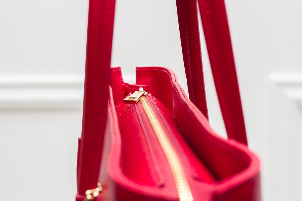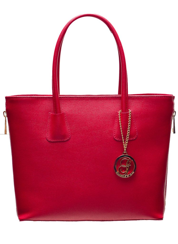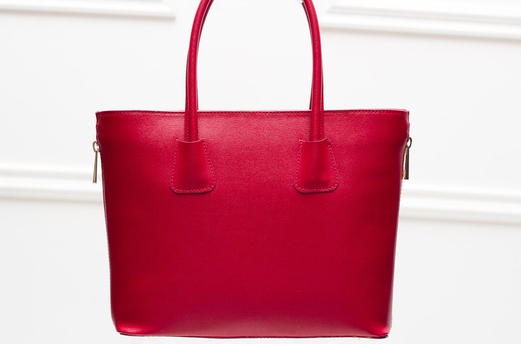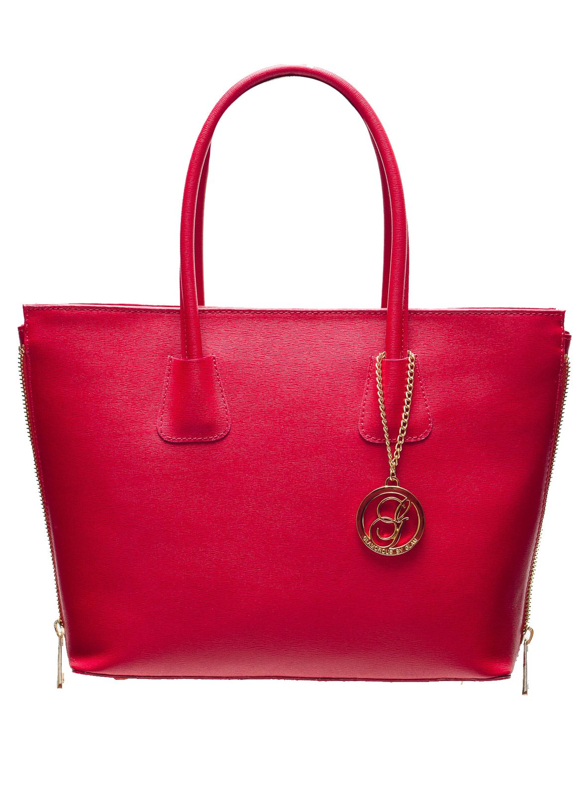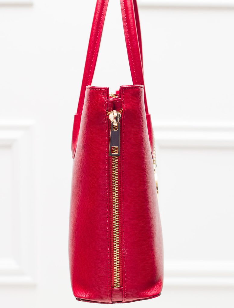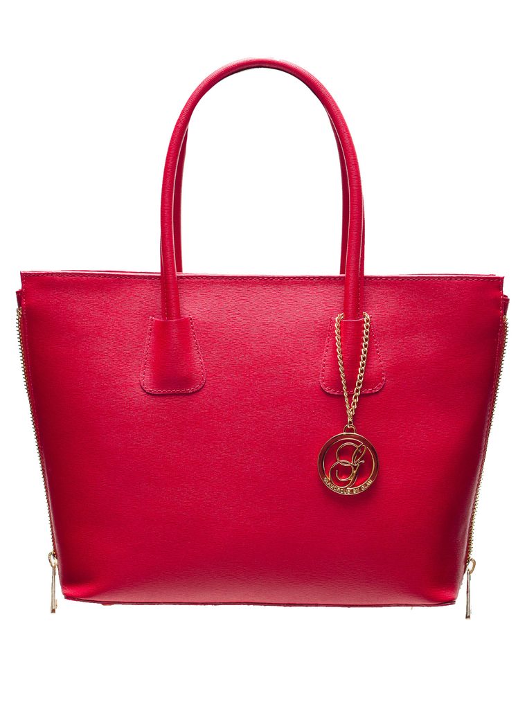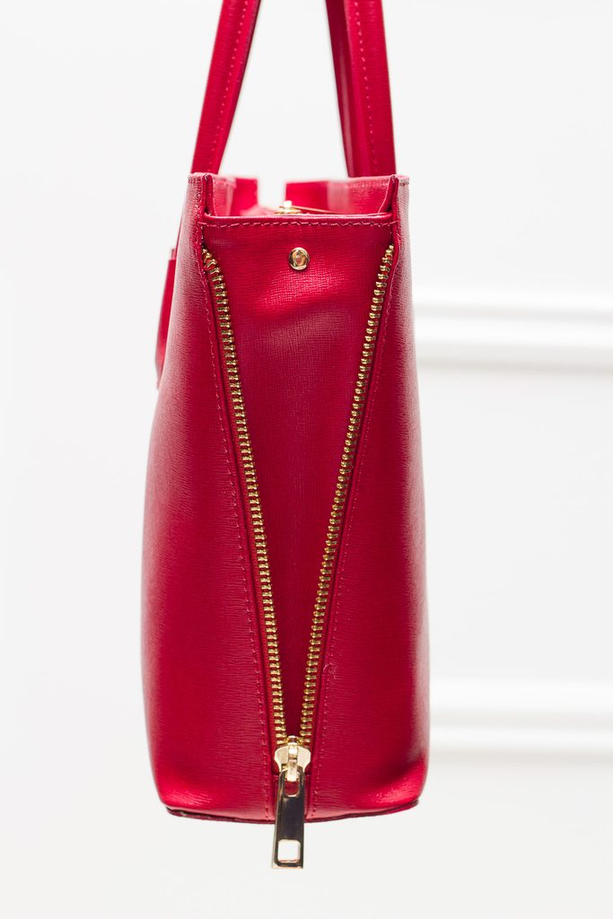 Dámska elegantná kabelka so zipsom v červenej farbe. Kabelka je celá zo safiánové kože, drží tvar. Má krátka pútka na nosenie v ruke. Zapínanie je riešené na zips. Boky kabelky sú dozdobené zipsom, ktorý je možné rozopnúť / zapnúť. U pútka je na ozdobu zlaté logo Glamorous by Glam. Kabelka je veľmi zaujímavá svojím strihom. Hodí sa k elegantnému outfitu do práce aj do mesta. Súčasťou kabelky je aj prídavný track.