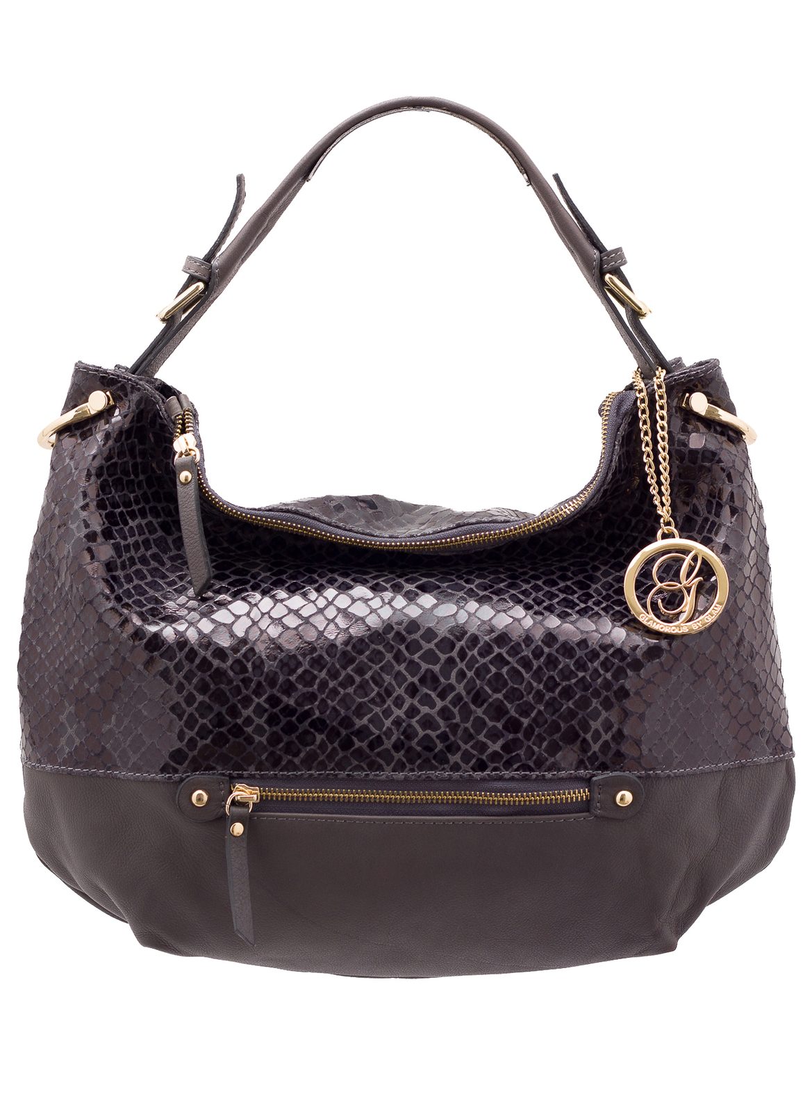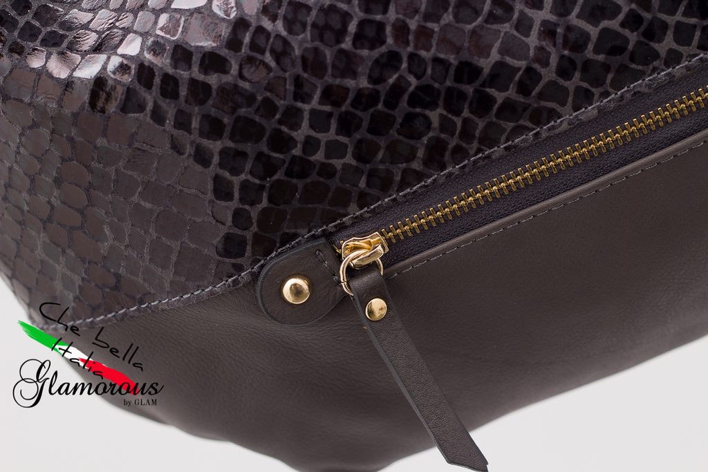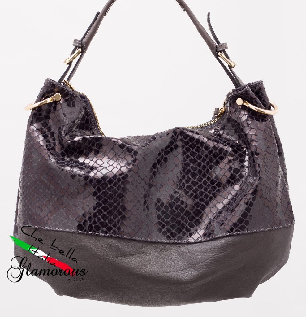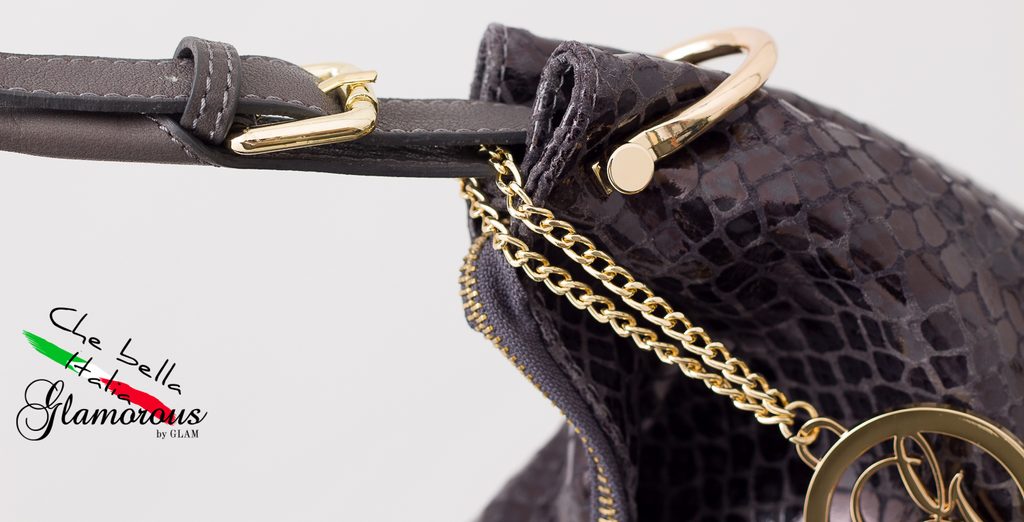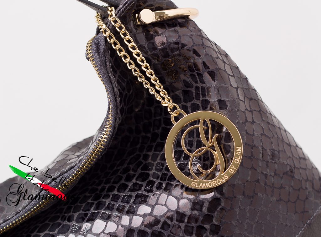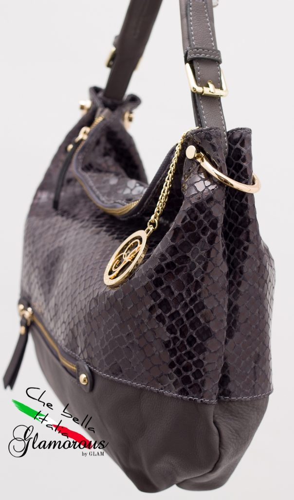 Dámská luxusní kabelka v šedé barvě. Celá z velmi jemné pravé kůže s hadím vzorem v hodní části kabelky. Poutka krátká do ruky i přes rameno, zapínání na zlatý zip. V zadní části je kapsička na zip. Kabelka má u poutka zlaté logo Glamorous by Glam. Vhodná k nošení v ruce i přes rameno a hodí se jak do města tak i do práce.