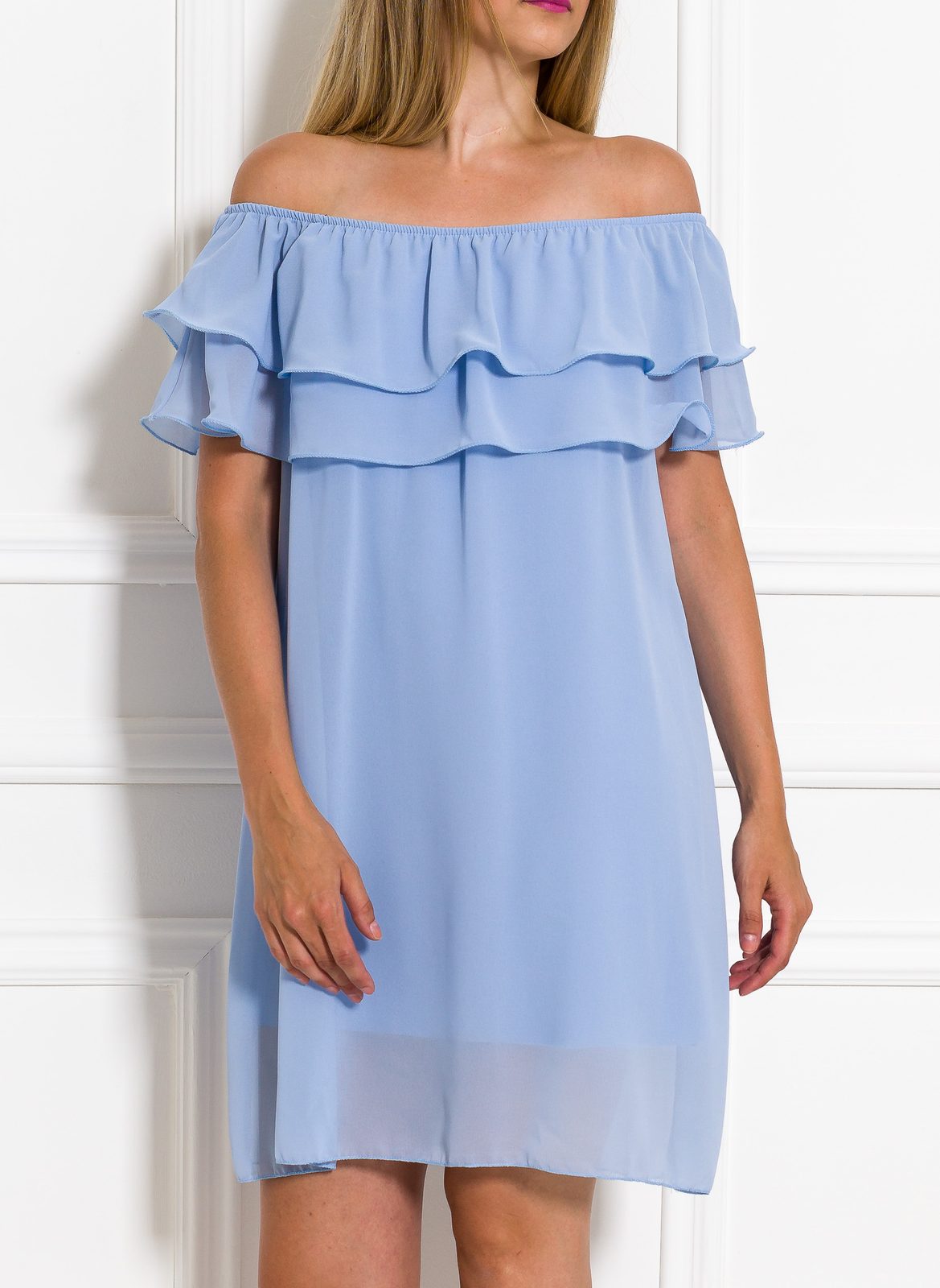 Dámské letní šaty s volánem ve světle modré barvě. Šaty jsou šifonové, mají široký volán přes ramena. Šaty nemají ramínka. Střih šatů je volný a vzdušný. Ideální na letní horké večery. Šaty krásně vypadají na těle. Vhodné jsou k nošení do města i pro volné chvíle.