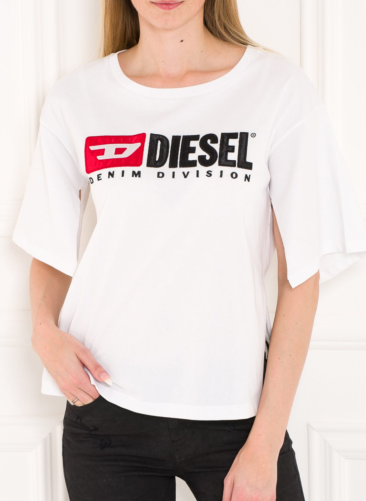 Dámske tričko s nápisom v bielej farbe. Tričko je značky DIESEL. Tričko má krátke rukávy, okrúhly výstrih. Strih trička je voľný a má výrazný motív nápisu Diesel. Rukávy a boky sú doplnené rozparky. Tričko je vhodné na nosenie k džínsom, do mesta aj pre voľné chvíle. P>