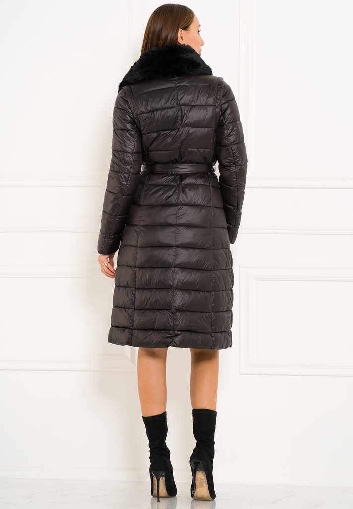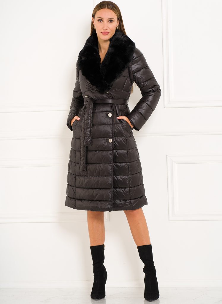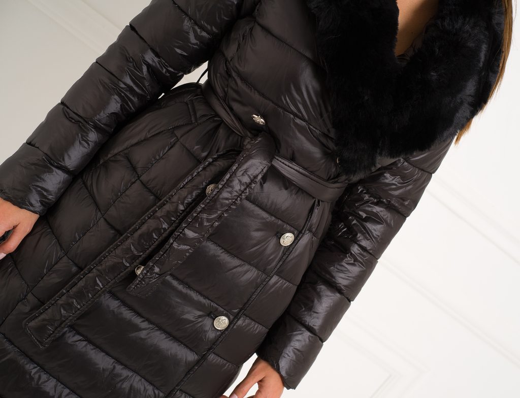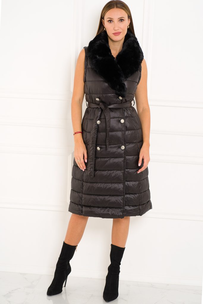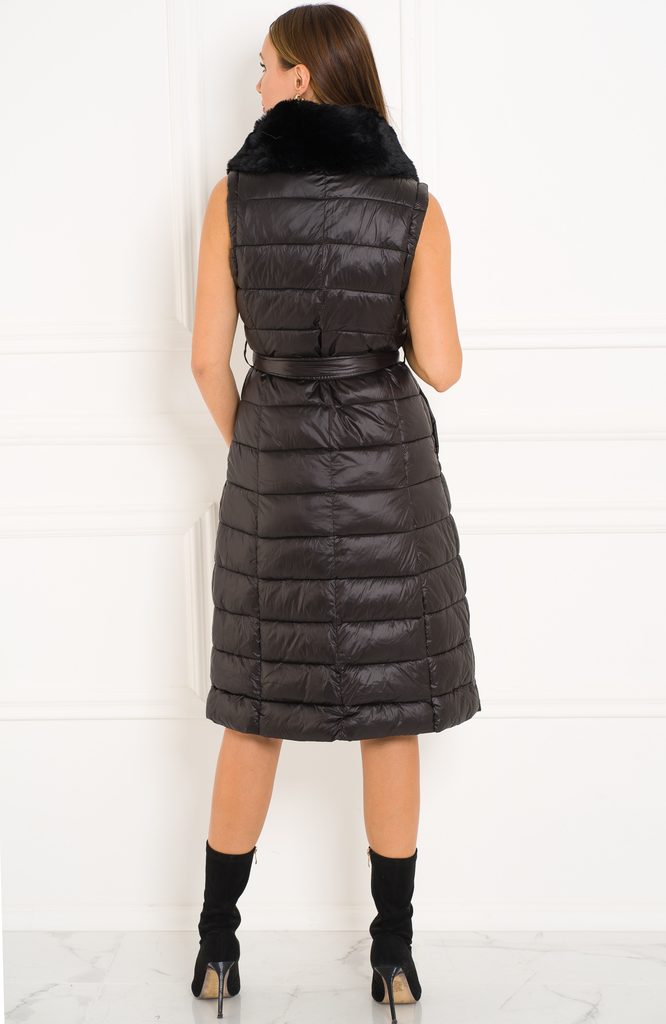 Dámská zimní bunda / vesta s páskem a kožešinou v černé barvě. Bunda má dlouhou délku a zapínání na patenty. V pase má bunda pásek na vázání. Kolem límce je bunda doplněna kožešinou. Zajímavým detailem je odepnutí rukávů, tím docílíte, že uděláte z bundy vestu. Bunda se hodí ke každodennímu nošení do práce i do města.