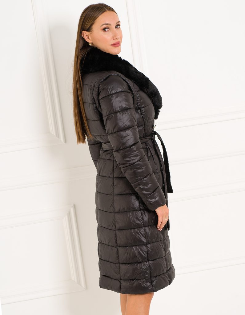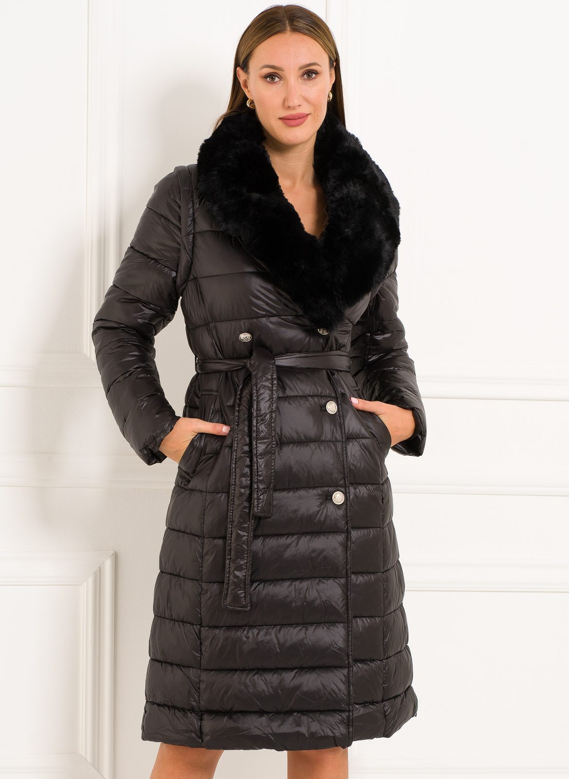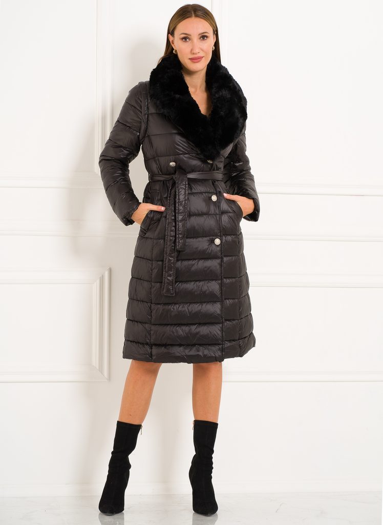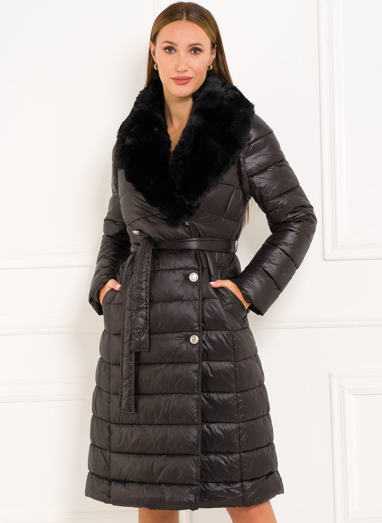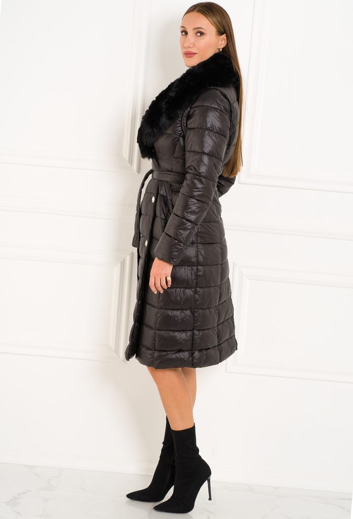 Dámská zimní bunda / vesta s páskem a kožešinou v černé barvě. Bunda má dlouhou délku a zapínání na patenty. V pase má bunda pásek na vázání. Kolem límce je bunda doplněna kožešinou. Zajímavým detailem je odepnutí rukávů, tím docílíte, že uděláte z bundy vestu. Bunda se hodí ke každodennímu nošení do práce i do města.
