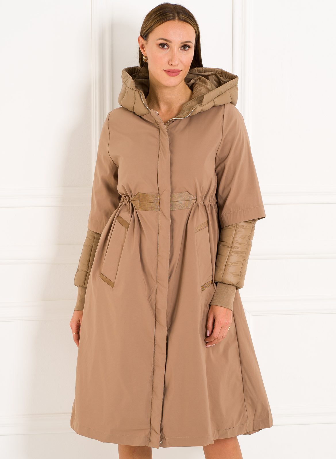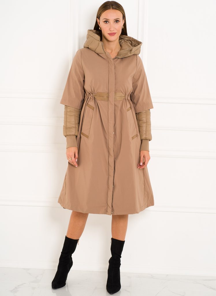 Dámská exkluzivní bunda v béžové barvě. Bunda má dlouhou délku a zapínání na zip. Po straně má bunda kapsy. Bunda je velice zajímavá střihem i materiálem. Skvěle sedí na těle. Bunda se hodí se ke každodennímu nošení.